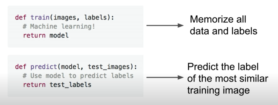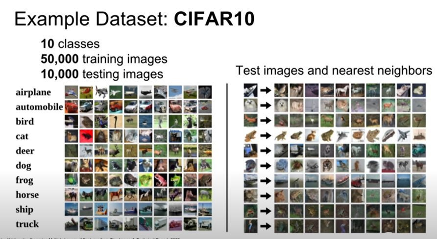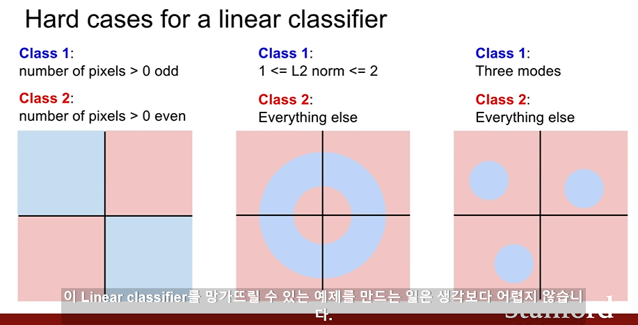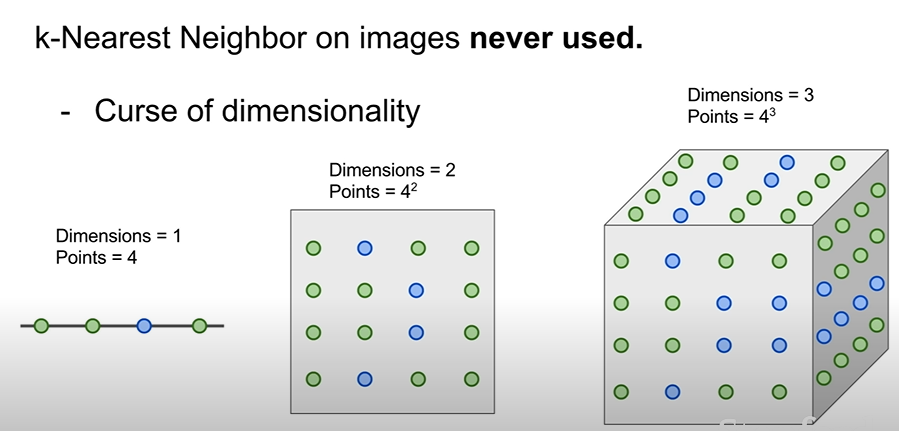 - 유사도(거리) 기반으로 예측하는 모델인데, 만약 두 class간의 거리가 비슷하다면 예측 정확도 떨어짐 특히 L2 의 경우 이미지간 유사도를 측정하는데 효율적이지 못한 척도인데, k-nn은 L1이나 L2밖에 사용하지 못한다.