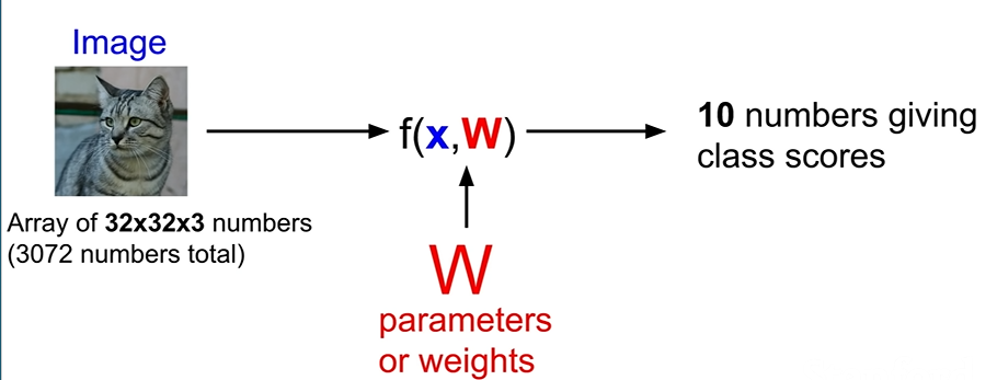 - w[10x3072] * x[3072 x 1] = y[10x1] ( ' * ' is dot product)