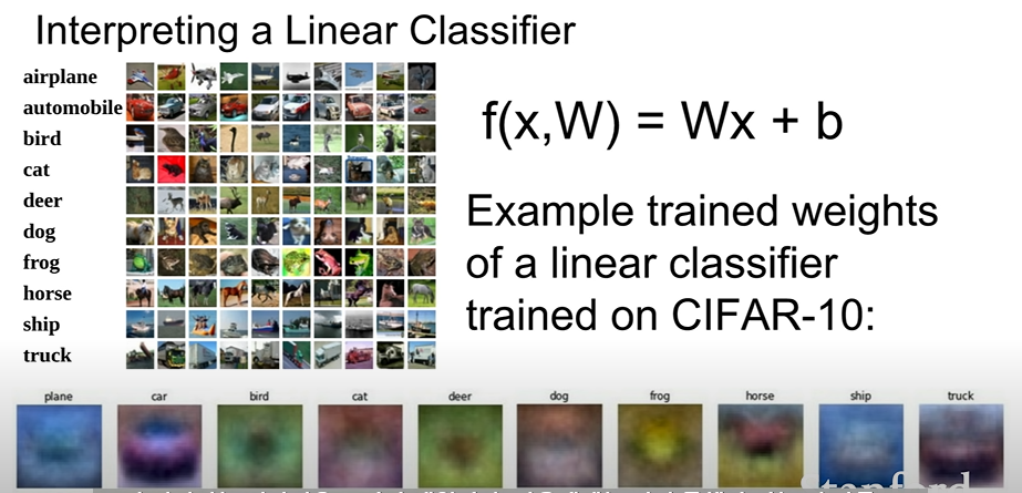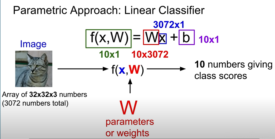 - We want to end up with 10 classes score -> The Weight matrix size shuould be 10x3072 x