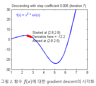 - 파라미터의 최적값을 찾기 위해 Loss function의 최소지점의 파라미터 값을 찾는 방식 中 하나.