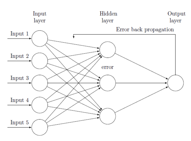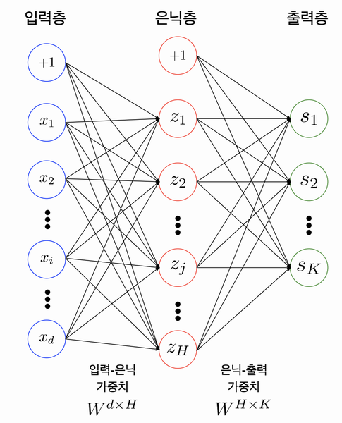- 입력층(input layer), 은닉층(hidden layer), 출력층(output layer) 으로 구성