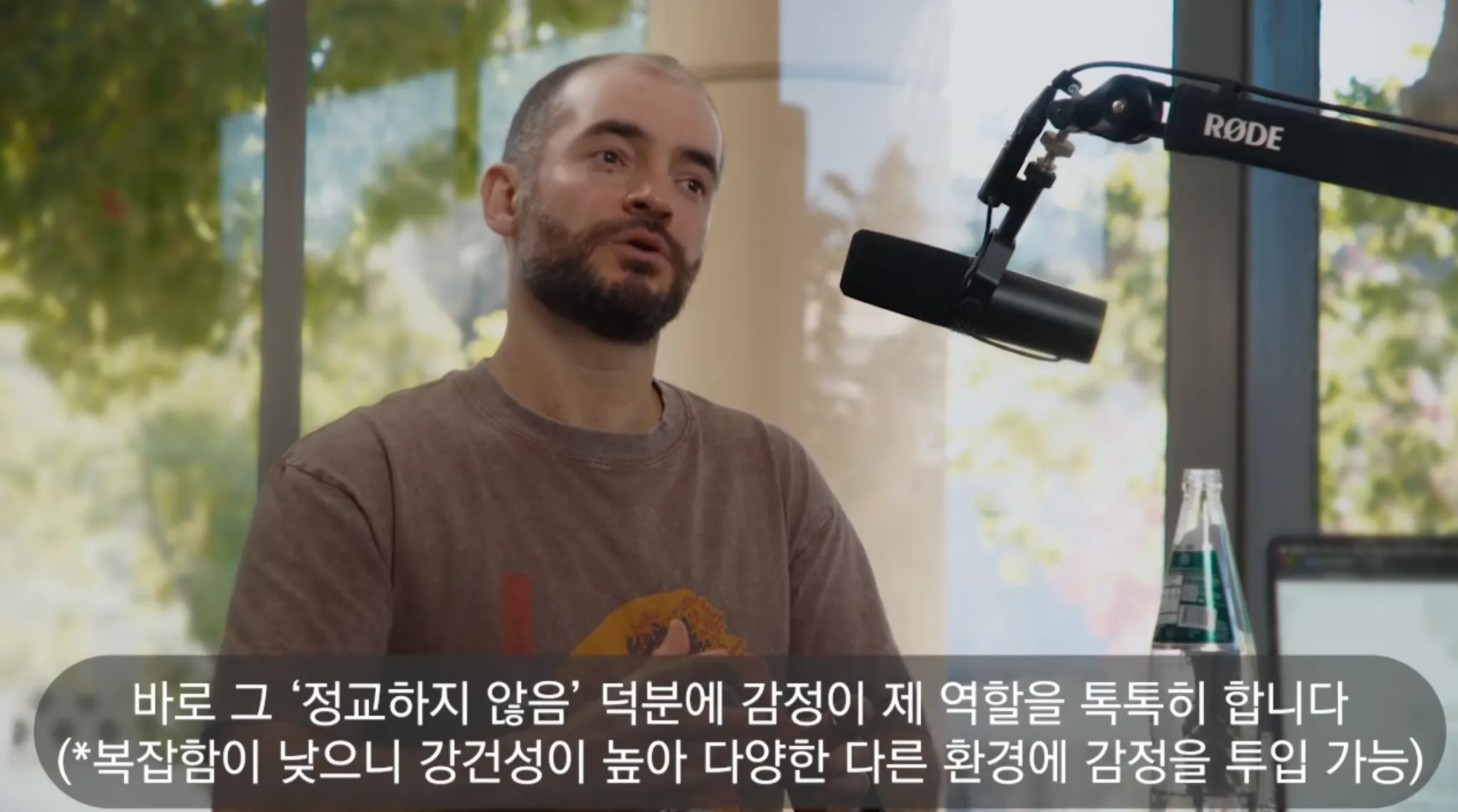 그리고 이것이 사람이 기계보다 더 효율적으로 기능하도록 해주는 이유는 아닐까 생각한다. 감정이라는 게 훨씬 단순한 시그널인건 맞지만, 단순할수록 강건하기 때문에 오히려 이 감정이라는 시그널이 일반화 성능을 높이는데 일조할 수 있다. (복잡성-강건성 tradeoff 이론)